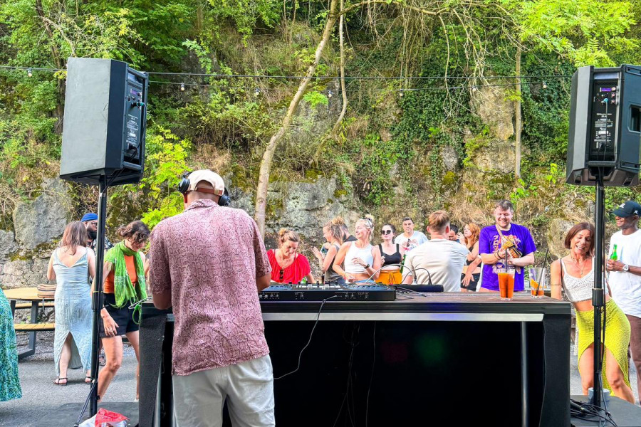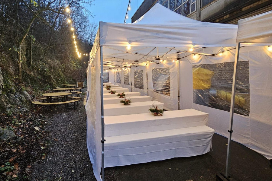 Das Außenlager bildet den wunderschönen uneinsehbaren hinteren Außenbereich der Alten Glaserei. Eingerahmt von dem Gebäude der Glaserei und einer imposanten begrünten Felswand erstreckt sich der Bereich über ca. 50 Meter in der Länge und gut 10 Meter in der Breite hinter der Halle und führt dann nochmals in etwa gleicher Größe seitlich um die Halle herum. Lichterketten auf der gesamten Länge sorgen auch bei Nacht für eine charmante Atmosphäre. Ob bestuhlt, mit Pavillons oder einer Außenbühne, einem Bierwagen oder einer Grillstation versehen. Ihrer Fantasie sind keine Grenzen gesetzt.