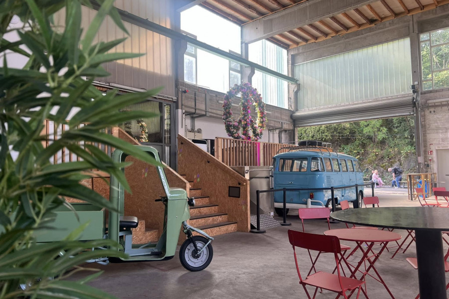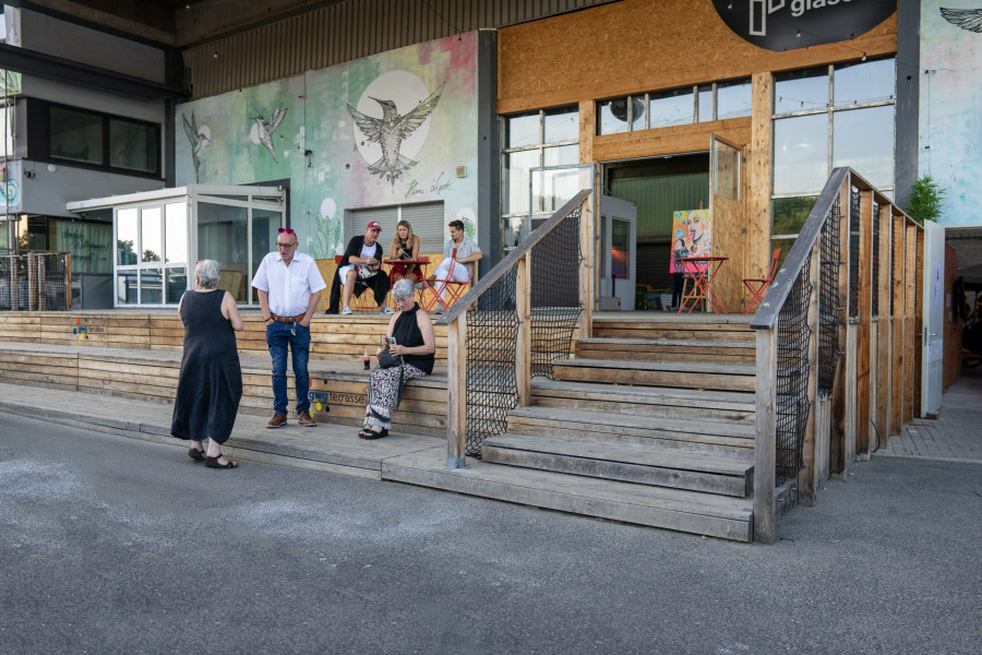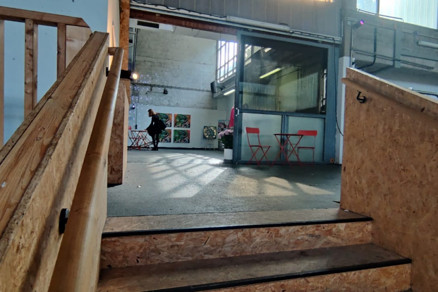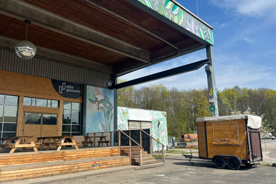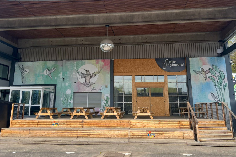Davon hat der Meister immer geträumt! Die ca. 80 m² großeTerrasse aus heimischem Edelkastanienholz mit einladenden Sitzstufen bildet den optischen Einstieg in die Alte Glaserei. Von hier aus geht es direkt in die Kranhalle oder in das Meisterbüro. Den Hintergrund dieses einladenden Ortes bildet das liebevolle und vielfach fotografierte Mural der renommierten Wuppertaler Künstlerin Hanna Ligeti (https://ligarti.com).